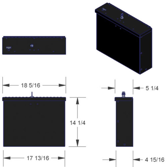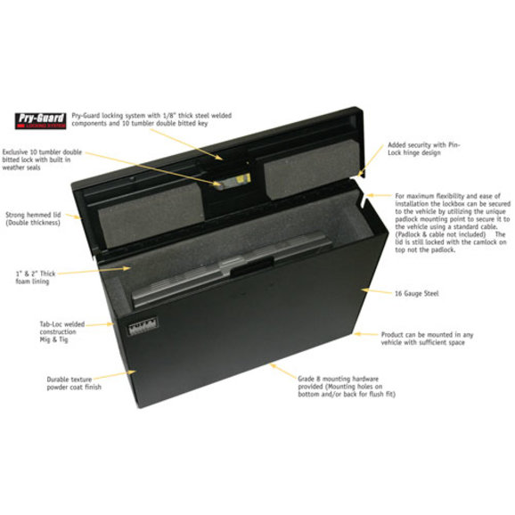 The unique design incorporates an exclusive hinging system and welded steel construction. Grade 8 mounting hardware is included with mounting holes provided for bottom or back flush surface mounting so the lockbox can be mounted behind the rear seat in a pickup truck or virtually any other place it can fit.