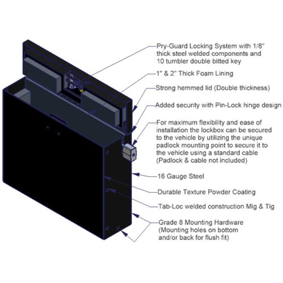 - For maximum flexibility and ease of installation the lockbox can be secured to the vehicle by utilizing the unique padlock mounting point to secure it to the vehicle using a standard cable. The lid is still locked with the camlock on top not with the padlock. (Padlock & cable not included)