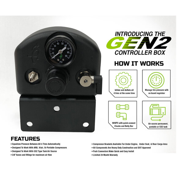 Up Down Air's Gen2 Air Delivery System allows you to easily manage air in all four tires simultaneously with either an on-board permanent air source or portable air pump. Kit comes with pre-cut hoses, push-to-connect fittings and all installation hardware needed for easy mounting to your vehicle. Compatible with EGOI 2, ARB and Viair compressors. Includes DOT Approved 3/8" air line, whips with quick connect chucks, ADS control box with air regulator and 90-degree Schrader valves. Features 5-year limited warranty.