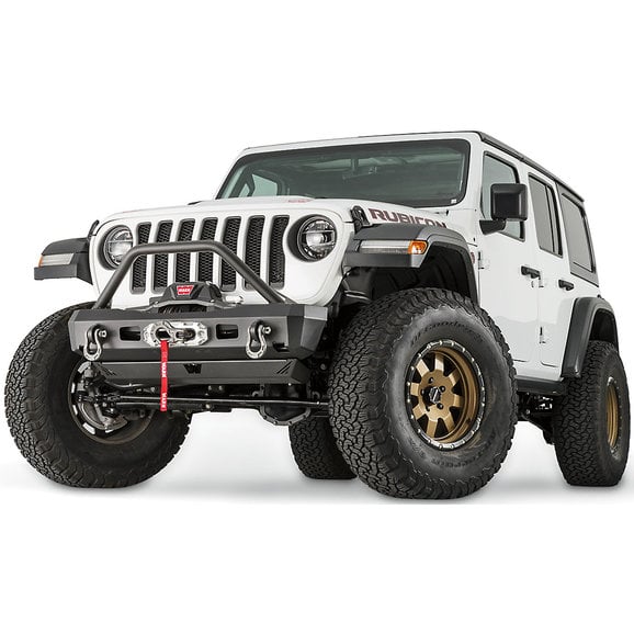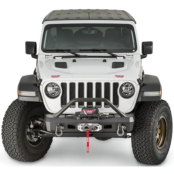 On the trail or on the road, the Elite Series Stubby Front Bumper with Grille Guard is a perfect choice to upgrade the front of the Wrangler JL vehicle. Warn designs, tests and manufactures all products in the USA, and this bumper is specifically designed for any model of Wrangler JL 2 or 4 door Jeep. The bumper is constructed of heavy duty steel, and finished in a flat black powder coat that has withstood 408 hours of salt spray testing. This bumper features a welded on tubular grille guard which provides extra protection to the front grille, and to the winch itself. Easily mount your choice of winch with the integrated winch mount. This bumper is more than capable of handling the high stress of winching, and will fit most Warn and aftermarket brands of winches. The precision welded recovery tabs will accept standard ¾” D-rings. Built in Jack points will come in handy while on the trail and allow easy access while jacking the vehicle. The geometry of this bumper will allow clearance for 37” tires with a 2” lift.