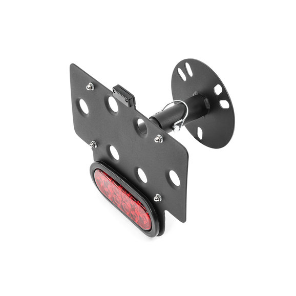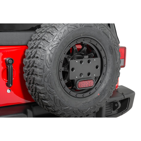 A perfect solution for those wanting to move their license plate away from the outside corners of the body of their vehicle, this Spare Tire License Plate Mount will create a mounting point inside the center of your tailgate mounted spare tire. The mount features a quick-disconnect pin for easy removal and adjustable settings to fit many applications.