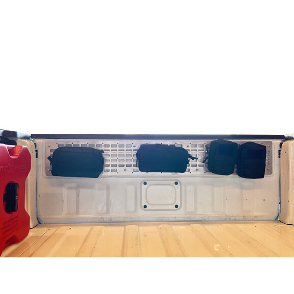 The Warrior Products Tailgate MOLLE Panel for Jeep Gladiator JT offers customizable mounting for gear. This convenient storage system Bolts on with no drilling or vehicle modification required. All installation hardware is included. This panel is equipped with rugged, heavy-duty aluminum construction. It is built to meet standard PALS pattern specifications and accepts all standard MOLLE bags and accessories.