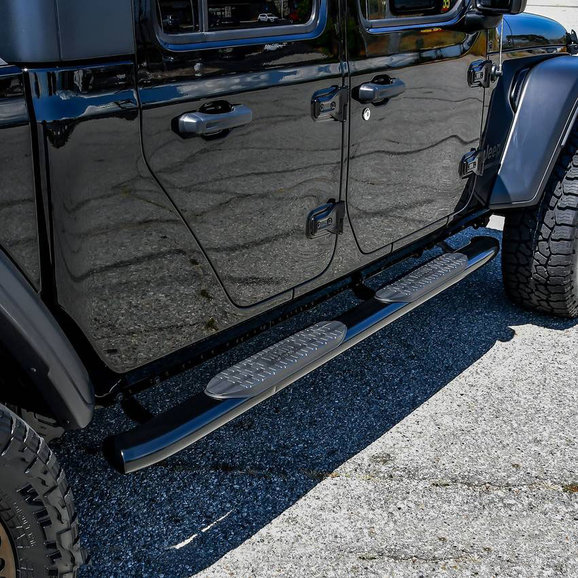 Features: a wide injection molded step pad with deep paved waterways that help keep the step free from water giving you a dry safe surface to step on when getting in or out of your Gladiator JT. Fully coated seamless ends with a 30 degree OE style bend to ensure no end caps or bolts are exposed.