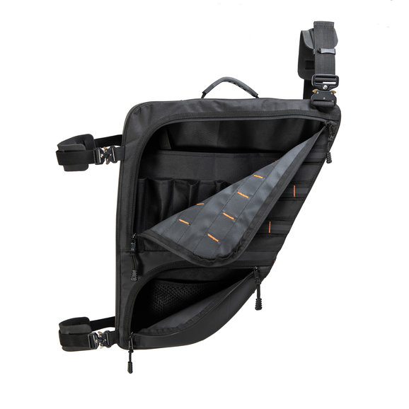 The Recon Storage Bags from XG Cargo creates useful storage where none exists on the roll cage of the Wrangler JK & JL 2 Door vehicles. These heavy duty bags are made using a ballistic nylon shell that can withstand any abuse from the elements. All of the attachments are military style metal buckles that secure the bags to the rear of the roll bar. The large internal pockets are ideal for carrying additional trail gear or even food that you will need while out on you next adventure. Each side of the storage bags feature built in Molle attachments for even more needed storage. The bottom compartments incorporate waterproof material that covers the door for added protection. The Recon bags attach and remove easily from the Jeep with no drilling or modifications necessary for the installation. Sold in Pairs
