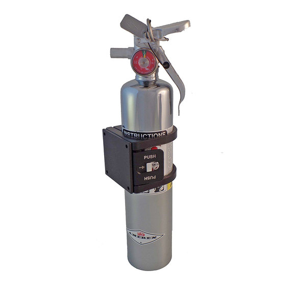 TEK208 Quick-Release Fire Extinguisher Holder can be mounted to most flat surfaces. Fits Amerex B417 ABC dry chemical fire extinguisher, Amerex B385TS Halotron (clean agent) fire extinguisher & H3R MX250R ABC dry chemical fire extinguishers which are 3″ in diameter.