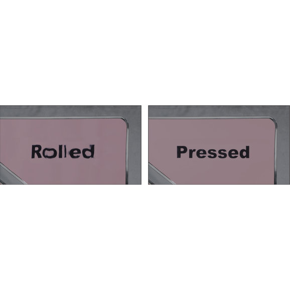 All QuadraTop Soft Tops Feature Press Polished Clear view Technology rear and quarter windows, where most "Value" soft tops on the market include rolled vinyl windows. Rolled Vinyl Window as shown below creates distortion making visibility extremely poor. QuadraTop's use Pressed Vinyl Window which drastically improves your vision when looking through your top windows. Our vinyl window panels are Factory Quality 30 mil thick as well as DOT approved for the ultimate in clarity and durability. QuadraTop Premium vinyl windows are 33% thicker than other comparable aftermarket soft tops providing longer soft top life and a quieter ride. All windows are completely removable for open-air enjoyment. (Example below shows actual printed paper behind window glass to demonstrated the difference between Rolled and Pressed vinyl windows)