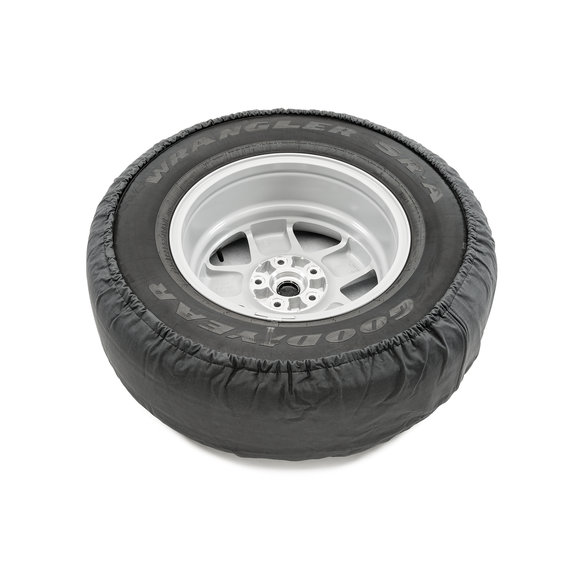 Premium Spare Tire Covers are made of a cotton/polyester blend with heavy-duty stitching and features an elastic anchor to securely hold the cover on the tire. These covers are custom fit to all tire sizes and are available in selected colors and logos.