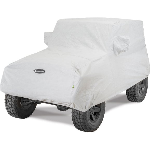 Quadratec's 3 Layer Softbond covers combine strength, breathability and water-resistant protection with exceptional value. Engineered to keep out liquid moisture without trapping condensation while providing excellent protection from tree sap, insects and weather. Quadratec's 3 Layer Softbond Covers feature top and bottom layers of soft non-woven polypropylene with a middle layer of water resistant film. The paint friendly plastic grommets and nylon cinch cords provide added security for longer term coverage in windy conditions. Front and rear hems have elastic material for a snug fit. The custom tailored patterns and oversized mirror pockets provide an excellent fit that also easy to install and remove. Protect your vehicle from rain, snow, dew, fog and sun, with the added protection from door dings, scratches and nicks. The embossed quick drying, breathable fabric wicks moisture away from the vehicle while allowing air to circulate from both sides. Softbond Covers include a drawstring storage bag and a 90" vinyl coated steel cable with anti-theft brass padlock. The included grommet kit provides a do-it-yourself radio antenna provision. Three year limited warranty.