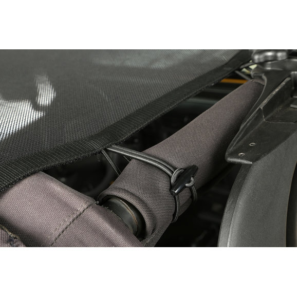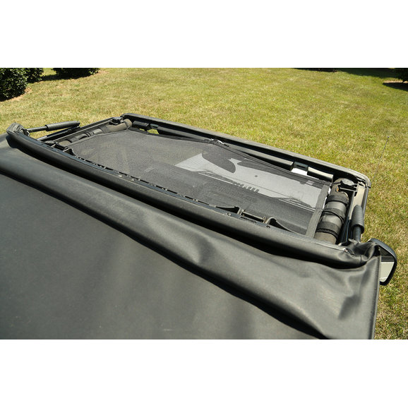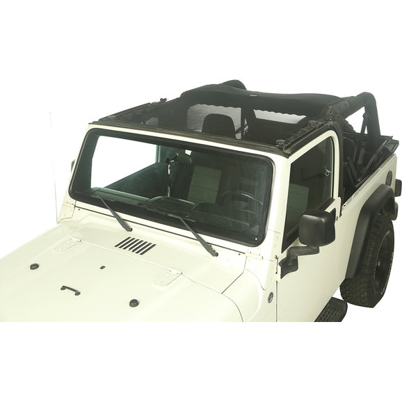 Craving that top down experience in your Jeep, but still want protection from harsh sunlight? This full-length shade protects both front and rear passengers from the sun while offering a ""top-down feeling"". With mesh construction, this sun shade is held between the windshield and the rear crossbar, eliminating the need for a header channel. The built-in elastic straps allows this design to retain access to the Jeep's top clamps, so you can keep the shade in place and still use the factory top.