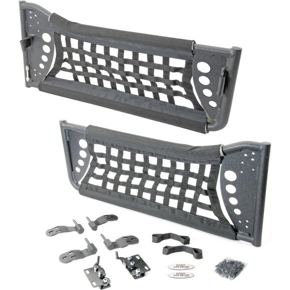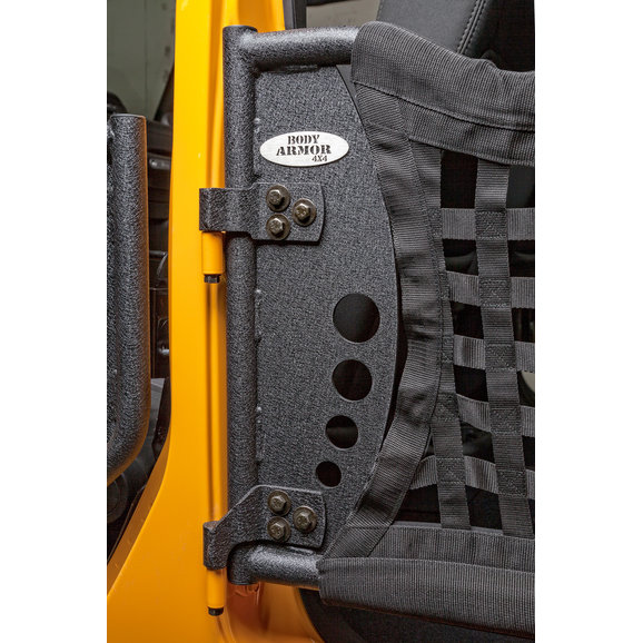 The New Body Armor Trail Doors are a Steel tube construction with durable black textured powder coat finish. Featuring an Exclusive hidden internal latch mechanism designed for secure closure. Steel plate gussets for style and strength. Simple installation, just take your factory doors off and slide the trail doors into the factory hinge, No need to modify the latch post. Complete with strong 1" wide, 1/8" thick woven nylon web door inserts for added protection from trail debris, comes with additional padding for comfort. Will Not accept OE Mirrors