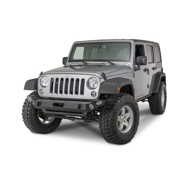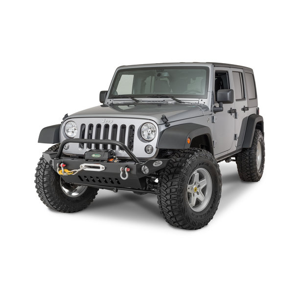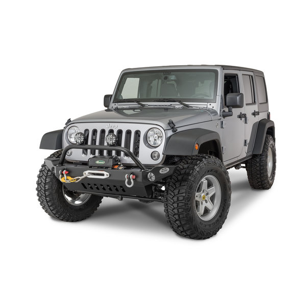 This heavy-duty bumper is fabricated using USA Grade 3/16" Steel Plate, laser cut, CNC formed, robotically welded, and hand finished by craftsmen. The D-Ring mounts are 5/8" Thick Plate and welded solid front and back so they can be used as recovery points. All JK Front Bumpers receive a thorough zinc phosphate rinse and cleaning, then are E-Coated and Powder Coated with a lightly textured black finish. Our unique textured finish is easy to clean and matches almost perfectly to the black factory fender flares. This bumper is completely Bolt on, No Drilling Required.