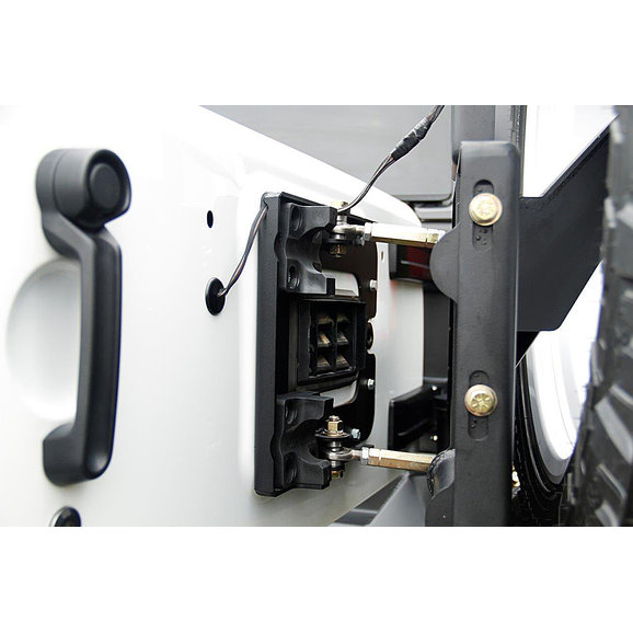 Building on their reputation for the highest quality and design in the Jeep market, the Fab Fours "Knife Edge" Rear Bumper with Off-The-Door tire carrier is the first ever 5-Point swing away system. The Dual rotating axis allows tire carrier to open with Jeep door while maintaining strength and durability. It is equipped with more accessory holes to better accommodate all attachment needs. Allows for High-Lift Jack Mount and Third-Brake Light attachments. It is fully adjustable to fit a range of tires and accommodates up to a 40-inch tire.