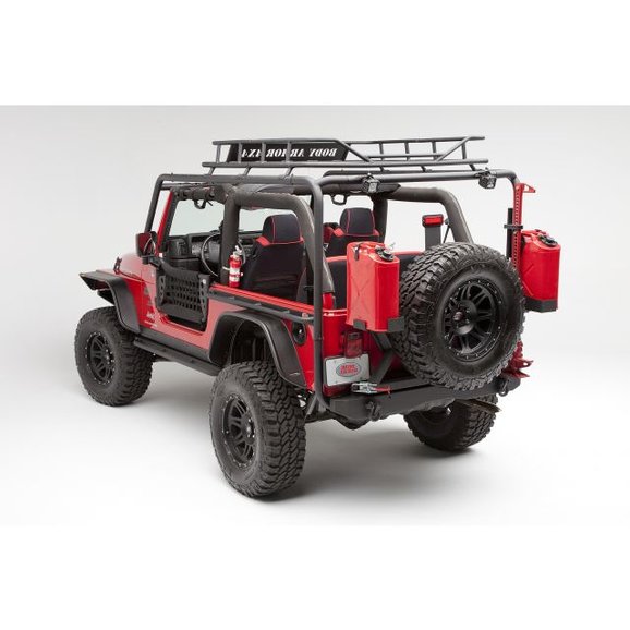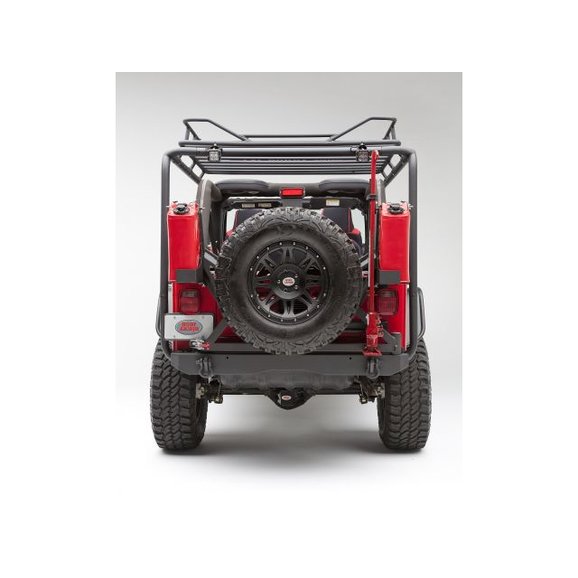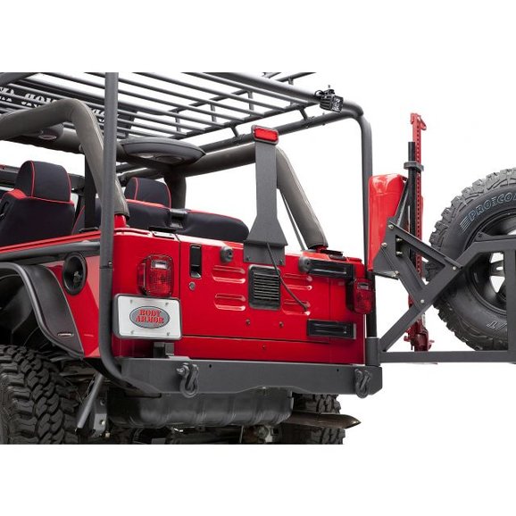 This new Body Armor rear bumper fits '87-'06 Wrangler YJ and TJ models. It is formed from 3/16" rolled steel plate. The bumper ends are reinforced along with fully integrated shackle mounts. Two step textured black powder coat finish makes for a long lasting durable bumper. Gas Can Adapter and Hi Lift Mount Kit sold separately.