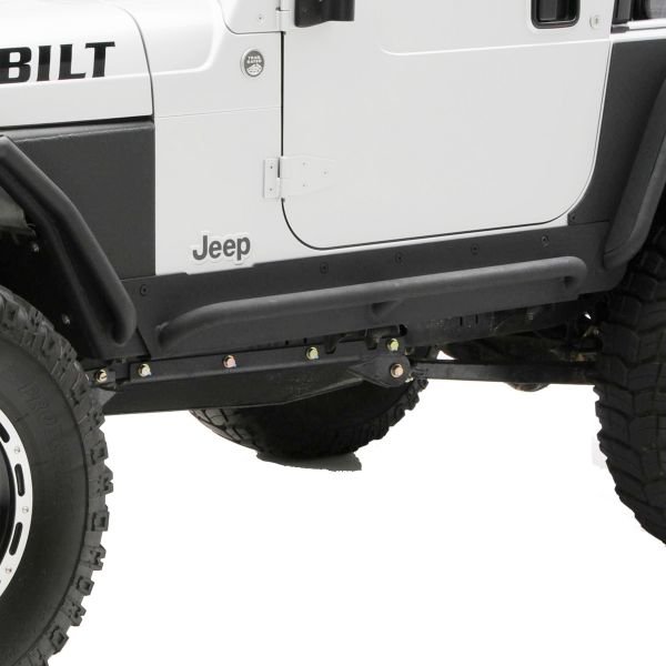 Each bumper has high degree approach angles and raised corners to maximize ground clearance, with 3/16" cold rolled steel bars robotically welded to the exact specifications. A two stage textured matte black powder coat is then applied for the ultimate look.  The front guard is manufactured from 1.75" tubing and has 2 light tabs to accommodate up to two 9" lights. Its unique design is capable of mounting up to 11,000 lb winch with the option of