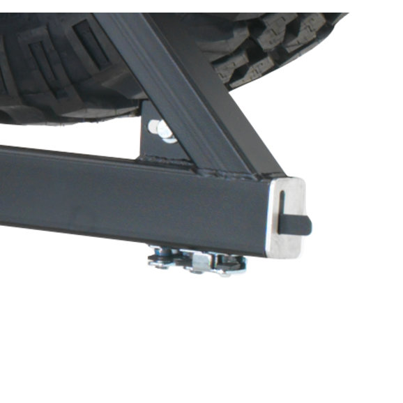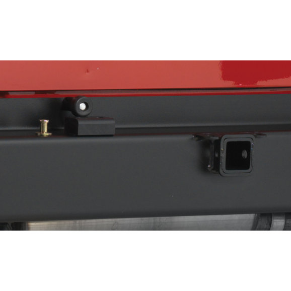 The Rock Hard Jeep JK Wrangler bumper tire carrier swings on 1 1/4" shaft, 2 3/4" hub with upper and lower sealed tapered roller bearings. Zerk fittings allow you to fill the hinge with grease. Also, notice the A-Frame swing stop built into the bumper. Spring loaded auto-locking pin system. Tire carrier locks in the open position so it will not swing back at you. To close, just lift tee handle on the pin and let it swing shut. An Integrated class 2 trailer hitch comes complete with safety change mounts.