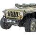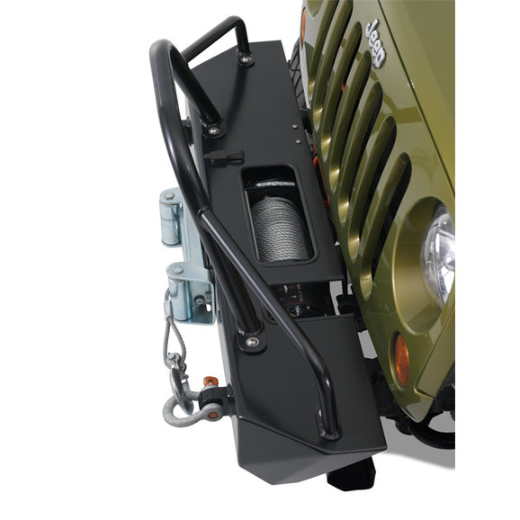 Warrior Products JK Stubby Winch Bumper with shown with Pre-Runner Brushguard. Side Profile. Fits 07+ JK Wrangler & Unlimited. Constructed of the same materials and finish as the rest of our Rock Crawler series bumpers, this model for the JK Wrangler can accommodate most self-recovery winch with a standard 4 ½ x 10 bolt pattern.