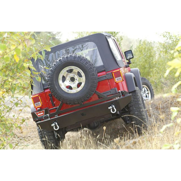 For carrying the oversize tires that serious off-roaders require, the rear bumper is available in a version that is designed to accept the WARN Tire Carrier. Built to carry heavier tires (up to 37"), the tire carrier pivots on a beefy 1-1/2" solid steel shaft pin, which comes up from within the bumper into the frame of the tire carrier. The shaft itself is welded, not bolted. Structural t-joint welds (vs. corner welds) mean the bumper holds up in the long run. Period. A polyurethane pad reduces rattling. Includes frame reinforcing brackets.