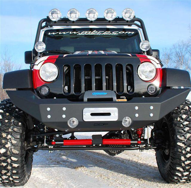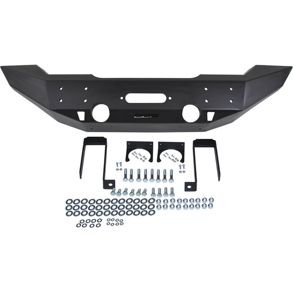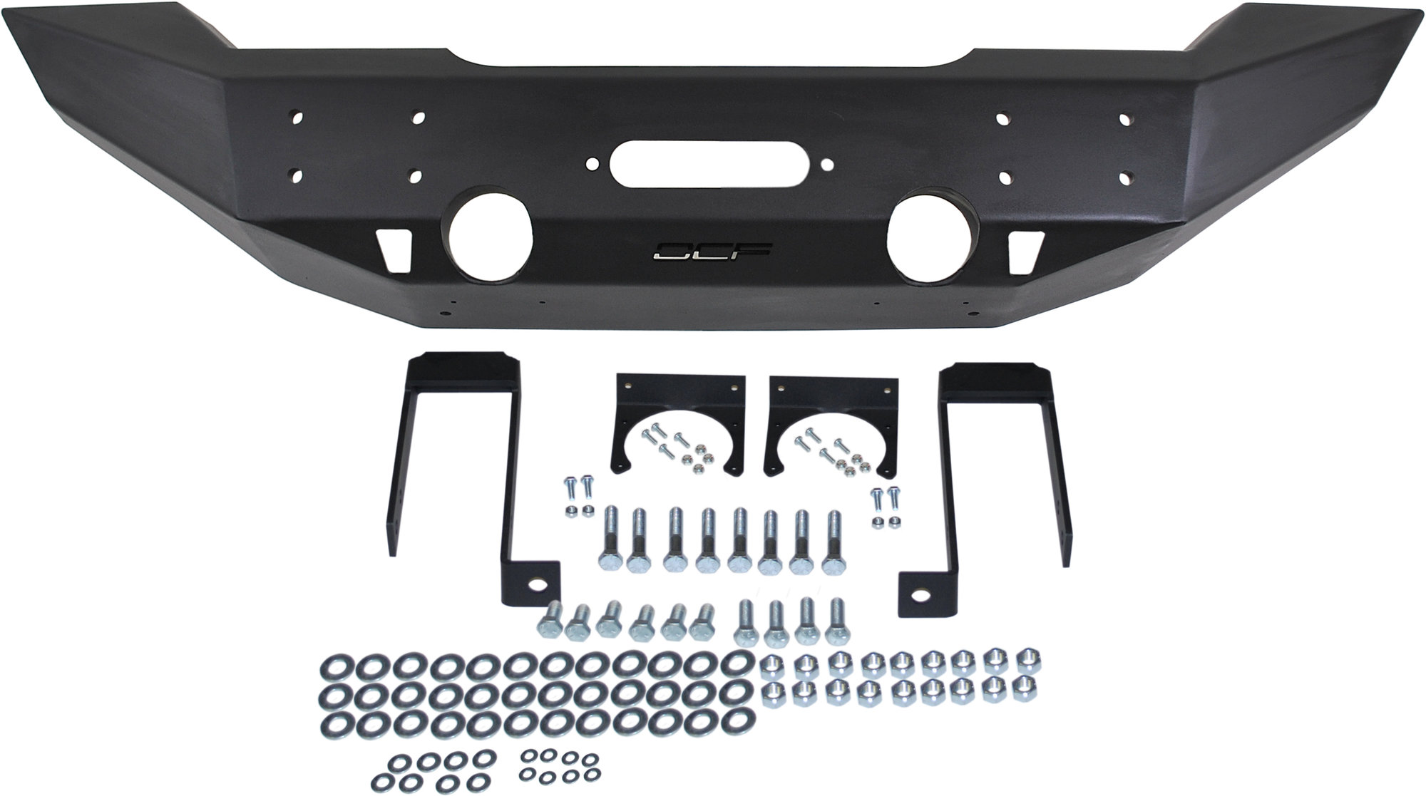Bolt on design that installs with simple hand tools. Accepts winches from all major manufacturers such as Warn, Ramsey, Superwinch, Mile Marker and T-Max. Accommodates 9.5 winches and select 12K winches within the bumper body and accepts roller fairleads. Integrated Hi-lift jacking points. Matches front width of factory fender flares for an aggressive and stylish look. Heavy duty powder coat finish to provide maximum protection for years to come. Heavy gauge CNC laser cut 3/16th steel plate construction. Massive ¼" steel plate mounting brackets. Accepts the factory fog lights for an OE look and simple installation. Accepts OCF Light Bar/Grill Guard and D Ring Mounts. Shown with optional OCF billet fairlead.