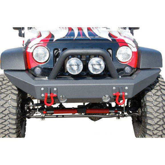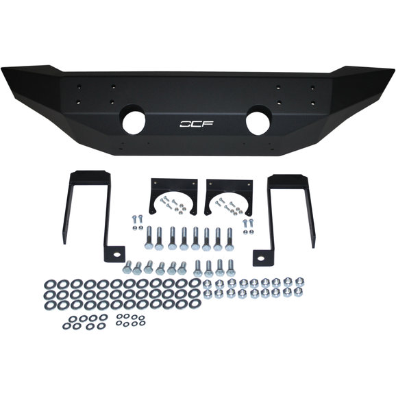 Bolt on design that installs with simple hand tools. Heavy duty powder coat finish to provide maximum protection for years to come. Matches front width of factory fender flares for an aggressive and stylish look. Integrated Hi-lift jacking points. Heavy gauge CNC laser cut 3/16th steel plate construction. Massive 1⁄4 steel plate mounting brackets. Accepts the factory fog lights for an OE look and simple installation. Accepts OCF Light Bar/Grill Guard and D Ring Mounts.