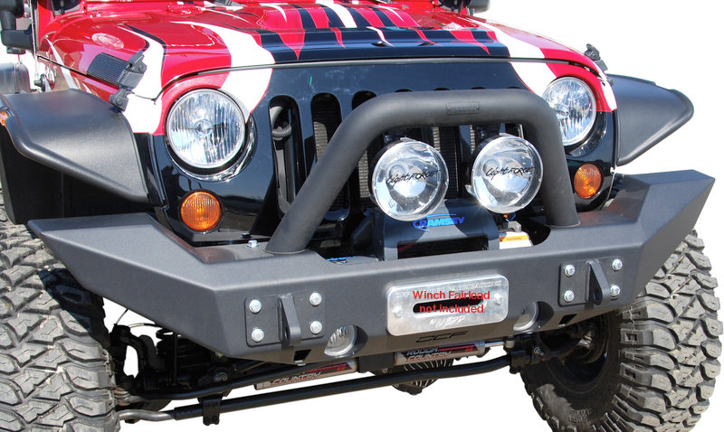 Bolt on design that installs with simple hand tools. Accepts winches from all major manufacturers such as Warn, Ramsey, Superwinch, Mile Marker and T-Max. Accommodates 9.5 winches and select 12K winches within the bumper body and accepts roller fairleads. Integrated Hi-lift jacking points. Matches front width of factory fender flares for an aggressive and stylish look. Heavy duty LINE-X coat finish to provide maximum protection for years to come. Heavy gauge CNC laser cut 3/16th steel plate construction. Massive ¼" steel plate mounting brackets. Accepts the factory fog lights for an OE look and simple installation. Accepts OCF Light Bar/Grill Guard and D Ring Mounts. Shown with optional OCF billet fairlead.