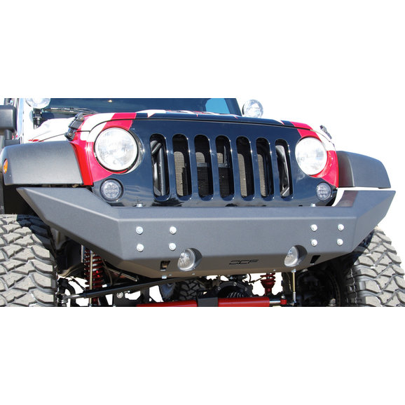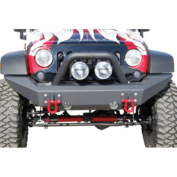 Bolt on design that installs with simple hand tools. Heavy duty powder coat finish to provide maximum protection for years to come. Matches front width of factory fender flares for an aggressive and stylish look. Integrated Hi-lift jacking points. Heavy gauge CNC laser cut 3/16th steel plate construction. Massive 1⁄4 steel plate mounting brackets. Accepts the factory fog lights for an OE look and simple installation. Accepts OCF Light Bar/Grill Guard and D Ring Mounts.