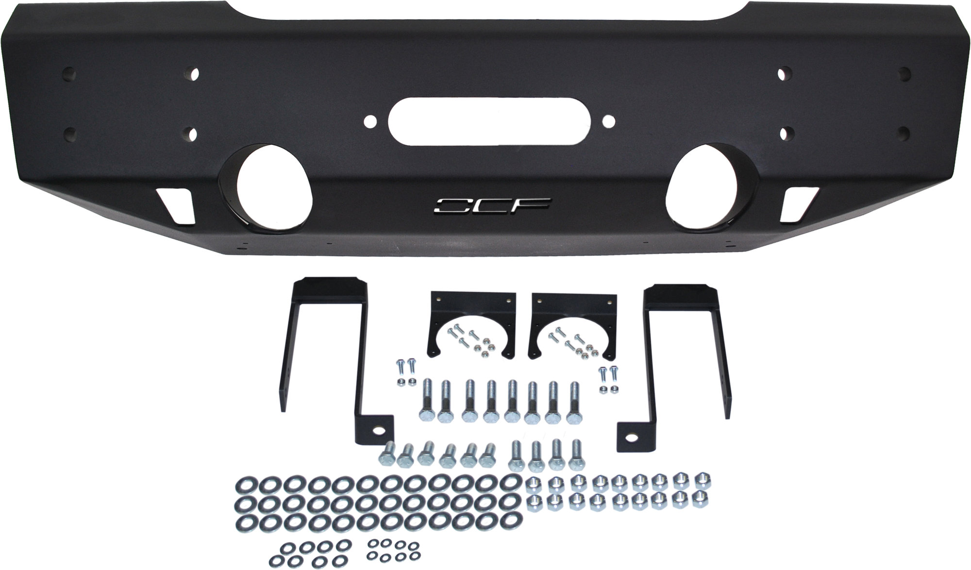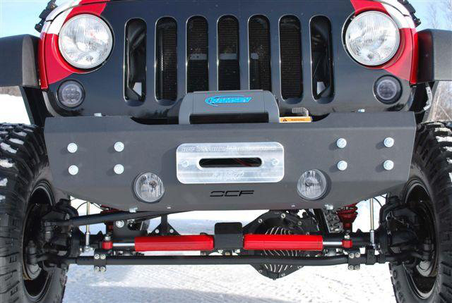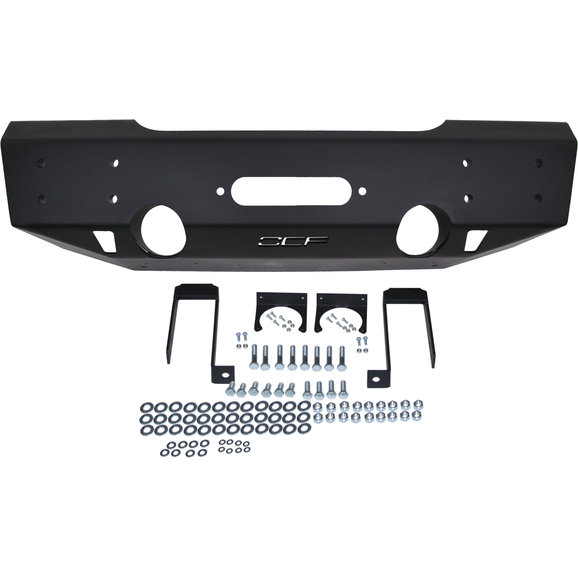 Bolt on design that installs with simple hand tools. Accepts winches from all major manufacturers such as Warn, Ramsey, Superwinch, Mile Marker and T-Max. Accommodates 9.5 winches and select 12K winches within the bumper body and accepts roller fairleads. Heavy duty powder coat finish to provide maximum protection for years to come. Heavy gauge CNC laser cut 3/16th steel plate construction. Massive ¼" steel plate mounting brackets. Accepts the factory fog lights for an OE look and simple installation. Accepts OCF Light Bar/Grill Guard and D Ring Mounts. Shown with optional OCF billet fairlead.