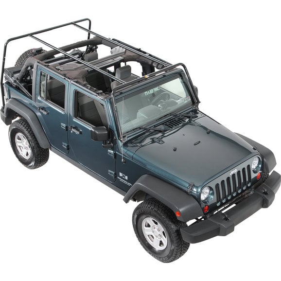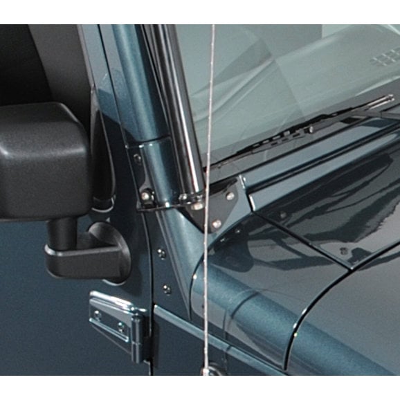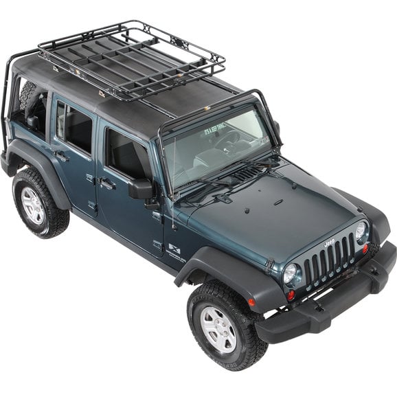 - Hinged rear brackets allow installation/removal of Jeep hard or soft top without removing Jeep rack.