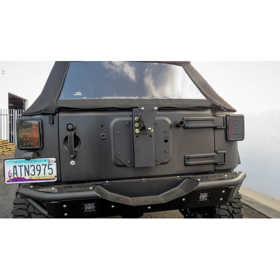 The Venom Tailgate Tire Carrier is a great option for the Venom Rear Bumper. Direct bolt on unit mounts directly to the tailgate replacing the existing spare tire mount and is capable of holding up to a 40" Tire. Hammer black finish matches the Venom Rear Bumper perfectly and completes the look of your JK!