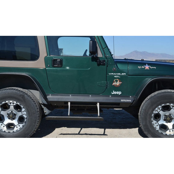 Introducing our newest addition to our product line. The R-SE Step-Slider, the only way to improve on the already proven design. Combining the functional slider and the need for a step. When the door is opened the step will deploy to allow access. Upon closure the step returns to the home position. Becoming a functional slider. The patent pending design allows for access to the front and rear doors of the vehicle. The supplied wiring harness includes a manual operation switch if the doors are removed as well as a system shut off if complete disable is required. (Recommended whenever the jeep is in 4wheel drive) In the event that the step comes in contact with an object while traveling in the down position, the step will stop and return to its home position upon closing the door. The step slider is the only step and slider combination on the market. Constructed out of 3/16 steel available in powder coated finish.