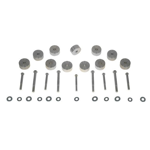 Lift the body away just a little (one inch) with these solid "Pucks" Have you got BIG tires that just barely rub the fenders of your Jeep® ? M.O.R.E. invented the one inch Jeep body lift "Puck" over 20 years ago. With the need to keep increasing tire sizes and a new generation of flexible suspension systems, it has become a necessity to move the body away from the frame for increased tire clearance. One inch doesn't sound like much; however, in most cases, these "pucks" and or complete body lift kits will give you the extra clearance you need, without making your Jeep® look like it's been lifted. M.O.R.E. body lift "Pucks" are made out of 6061-T6 aluminum. We're talking about aircraft quality stuff here! They will not crush, break or slip around once bolted in place. Natural aluminum color looks great under your rig, and there's no plastic to break or look "cheap."