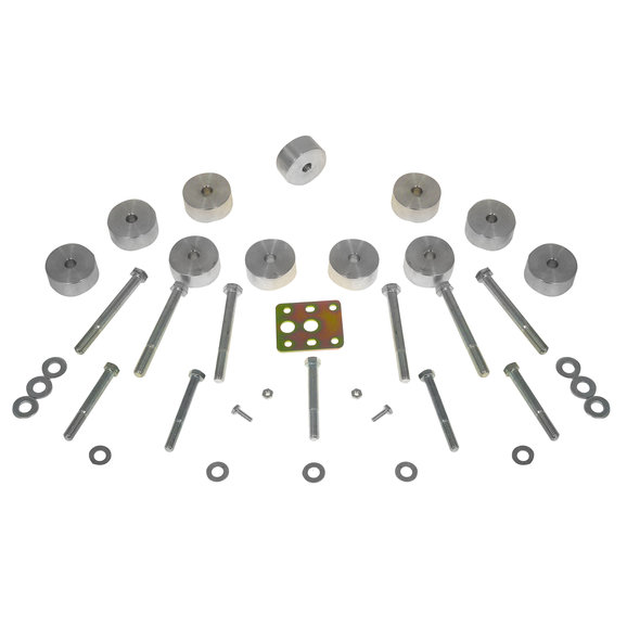 Lift the body away just a little (one inch) with these solid "Pucks" Have you got BIG tires that just barely rub the fenders of your Jeep® ? M.O.R.E. invented the one inch Jeep body lift "Puck" over 20 years ago. With the need to keep increasing tire sizes and a new generation of flexible suspension systems, it has become a necessity to move the body away from the frame for increased tire clearance. One inch doesn't sound like much; however, in most cases, these "pucks" and or complete body lift kits will give you the extra clearance you need, without making your Jeep® look like it's been lifted. M.O.R.E. body lift "Pucks" are made out of 6061-T6 aluminum. We're talking about aircraft quality stuff here! They will not crush, break or slip around once bolted in place. Natural aluminum color looks great under your rig, and there's no plastic to break or look "cheap."