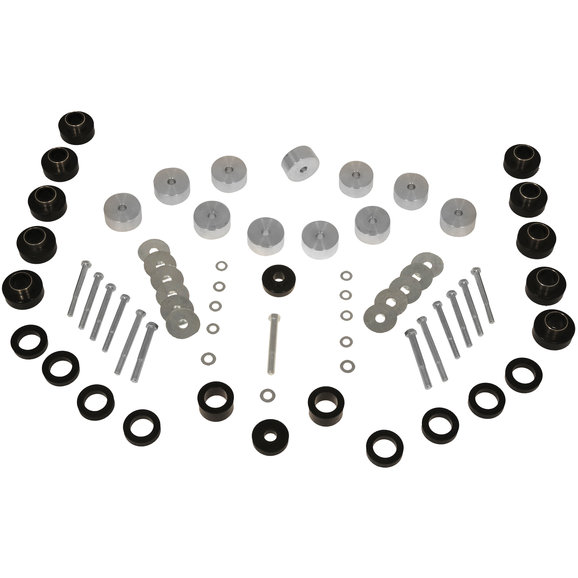 M.O.R.E. "Body Lift Systems" come with everything the standard body lift comes with in addition to new polyurethane body mounts. You'll save time and money when you install the System under your rig. Replace the old worn out rubber body mounts that are on your Jeep® with new Polyurethane. These specially formulated Polyurethane bushings are soft enough to allow flex yet tough enough to withstand heavy duty abuse. They will not 'squeak" or make noise. The factory tube/sleeves must be re-used for CJ applications.
