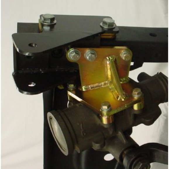 M.O.R.E. has answered the problem with the steering when you move your front axle forward. This New Heavy Duty steering box bracket will move your steering gear forward 1- 1/4". This will keep the drag link from interfering with the tie rod and like the standard bracket will keep the steering gear from being ripped off the frame. Made from 3/8" and 1/2" steel plate.