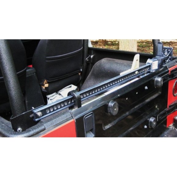Having trouble finding a suitable location to mount your hi-lift jack on your TJ? Try the new River Raider high lift jack mount. This system utilizes the back side of the factory roll cage seat belt mount for a secure mounting location for your 48" high lift jack. The brackets come standard with a durable, textured black finish. This easy to install kit does not impede the removal of a hard top or the lowering/raising of your soft top. The kit includes all heavy duty 1/2" hardware, 1/2" thread tap, and installation instructions.