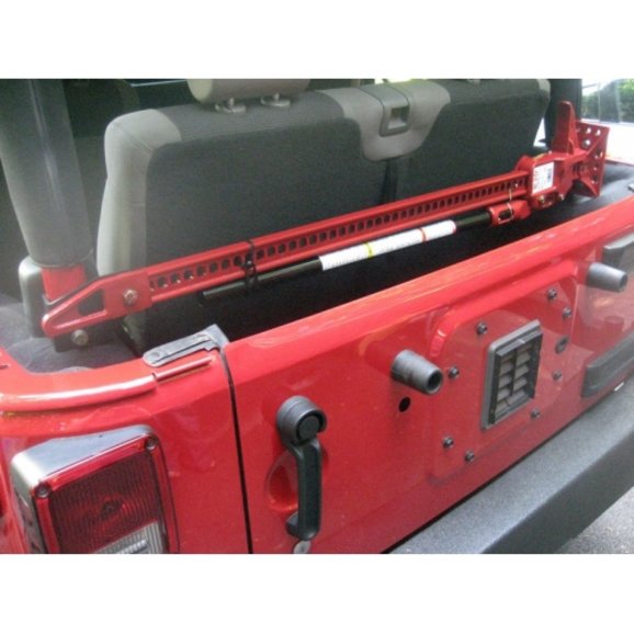 Having trouble finding a suitable location to mount your hi-lift jack on your JK? Try the new River Raider high lift jack mount. This system utilizes the back side of the factory roll cage seatbelt mount for a secure mounting location for your 48" high lift jack. The brackets come standard with a durable, textured black finish. This easy to install kit does not impede the removal of a hard top or the lowering/raising of your soft top on your 2 or 4 door JK. The kit includes all heavy duty 1/2" stainless steel hardware, 1/2" thread tap, and installation instructions. This Mount is fully compatible with all 07-10 JK Jeeps. For Jeeps 2011 or newer you must trim some factory plastic to install these mounts. We recommend the Hood Mount for 2011-2012 JKs.
