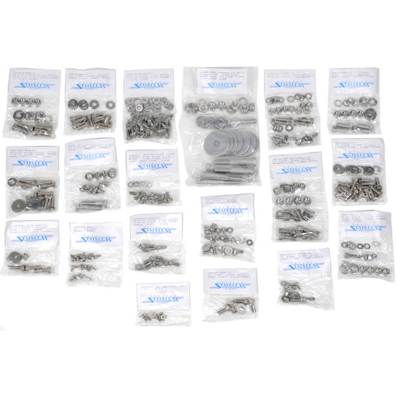 Throw out that rusty old hardware and restore it the right way. These complete body kits contain individually labeled component kits to eliminate the guesswork. You'll get brand-new stainless steel hardware for body mounts, bumpers, cowl vent, dash, door latches, door strikes, fender flares, fenders, fuel filler, top, under hood braces, hinges, trans cover, roll bar, spare tire carrier, radiator mount and much more.
