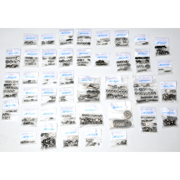 Throw out that rusty old hardware and restore it the right way. These complete body kits contain individually labeled component kits to eliminate the guesswork. You'll get brand-new stainless steel hardware for body mounts, bumpers, cowl vent, dash, door latches, door strikes, fender flares, fenders, fuel filler, top, under hood braces, hinges, trans cover, roll bar, spare tire carrier, radiator mount and much more.