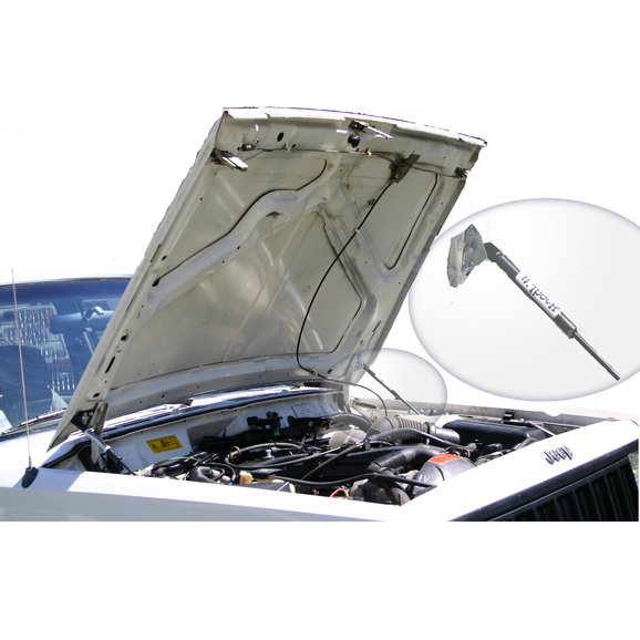 Convenience and safety! Lift your Jeep® hood with just one hand. Dual gas shocks raise and hold the hood in an upright position. Simply raise the hood about a foot and as the support shocks take over, just let go! Works like a Jeep hardtop lift gate. Slight downward pressure closes your hood with ease. Eliminates the need for a hood prop.