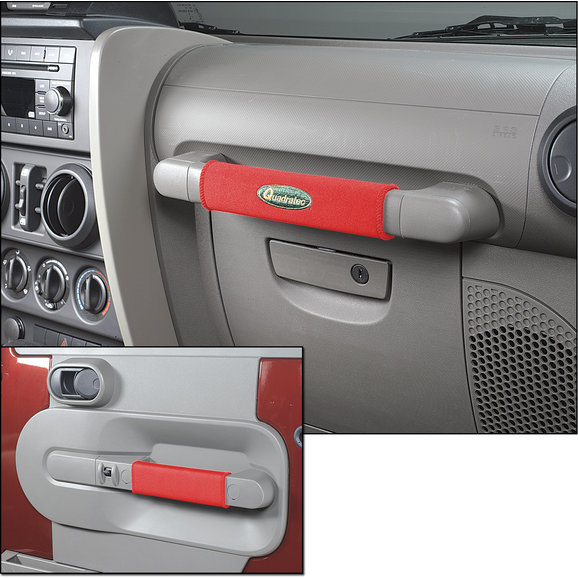 Adds a distinctive touch to interior door panel pulls & dash grab bar. Sets include three custom cut and sewn neoprene fabric wraps that instantly attach with hook and loop strips. Dash grab bar wraps feature an embroidered Quadratec oval logo. Available in either red or black.