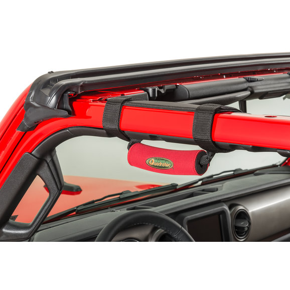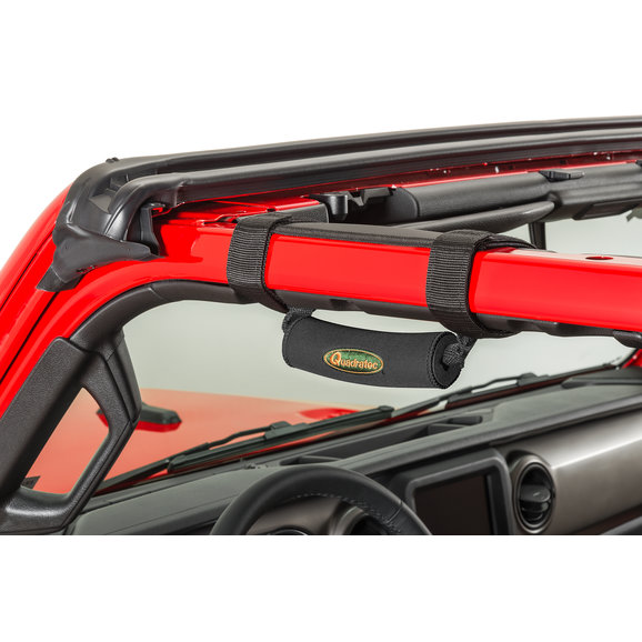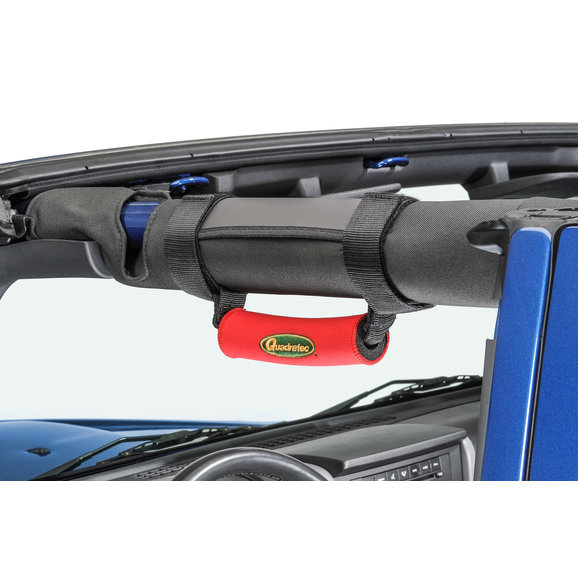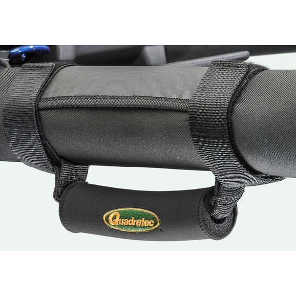 Our Deluxe Grab Handles provide the much needed ergonomic assistance to driver and passenger while climbing in and out of the vehicle. Features medium density foam cushioned grips wrapped in soft neoprene with embroidered Quadratec logos. Installs in minutes and securely mounts to all sport bars using two fully adjustable nylon web straps with hook and loop fasteners. Sold in pairs.