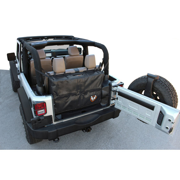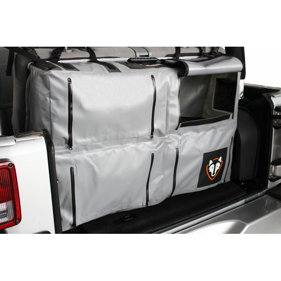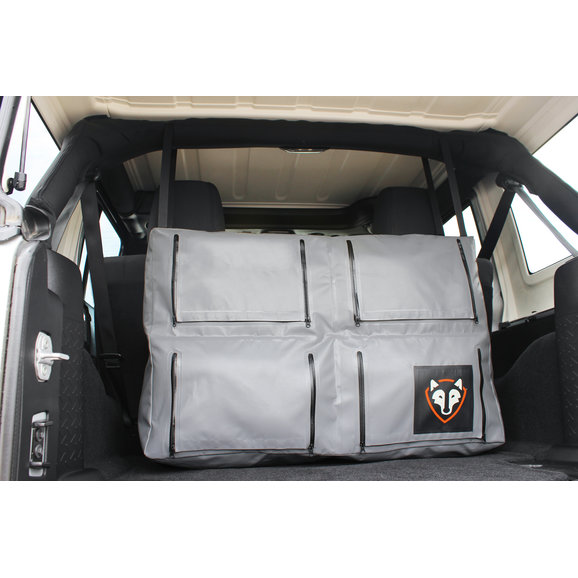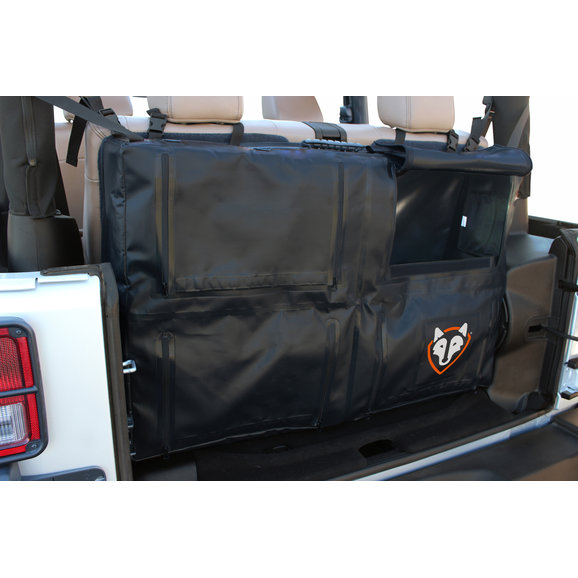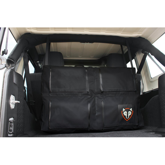 Be ready, cuz this thing is huge! It takes up the full width of my 2 door 2013 JK Sport and the height is from the floor to the top of the back seat. The storage space is great. The back of my Wrangler used to be a mess of gear and tools, and now it all neatly fits into this bag.