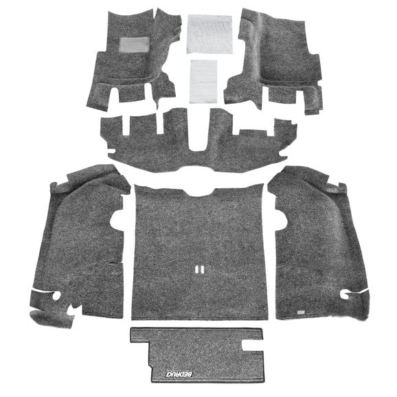 Looks and feels like cut pile carpet and custom molded for a perfect fit; and we mean PERFECT! The full 7-piece custom molded liner system is easy to install and even easier to remove and hose off after a long day on the trail. Bedrug does not absorb water and will dry in as little as 20 minutes. It's resistant to harsh chemicals, such as bleach, oil, battery acid and gasoline and is both fade and UV resistant. There's nothing to trim and there's no tools required to install or remove for cleaning.* The bedrug material is super resistant to stains, odors, mold and mildew and the 1/4" thick polypropylene foam insulates your interior from road noise and heat. Driver area features a tough plastic heel pad that's stitched into place. Backed by a 30-day money back guarantee and a lifetime warranty.