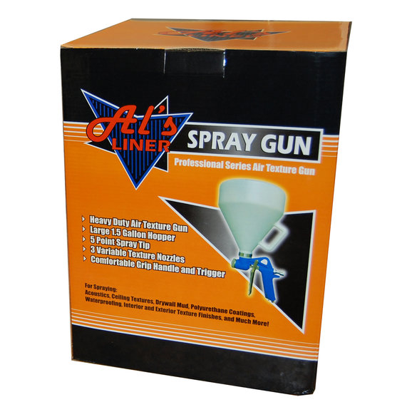 Al's Liner Air Texture Guns are ideal for applying Al's Liner DIY Truck Bed Liner Kits to all of your Al's Liner projects. These guns were designed to give you the right tool for any customized application you choose, whether you're adding traction to the floor of a moving truck, protecting the undercarriage of an ATV or laying down a long-lasting custom logo in the bed of your truck. With its special 5-point spray texture nozzle, this gun will maximize the durability of your Al's Liner Kit while allowing a customized texture and thickness to match any finish you like. With a simple air regulator, you can adjust the air pressure and achieve a variety of textures. The Al's Liner Air Texture Gun also has an adjustable trigger pull mechanism that allows you to set the maximum amount of trigger you can pull wherever you like it. It is easy to clean and disassemble for a simple and hassle-free job. After using the Air Texture Gun with Al's Liner DIY Truck Bed Liner Kit material, spray the interior with AL's Liner LMR to help facilitate cleaning. For more information on spraying Al's Liner Truck Bed Liner Kits with the Air Texture Gun, refer to the Al's Liner DIY Truck Bed Liner instructions. When you need a professional protective coating that fits your project like a glove, Al's Liner Air Texture Guns have you covered.