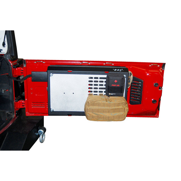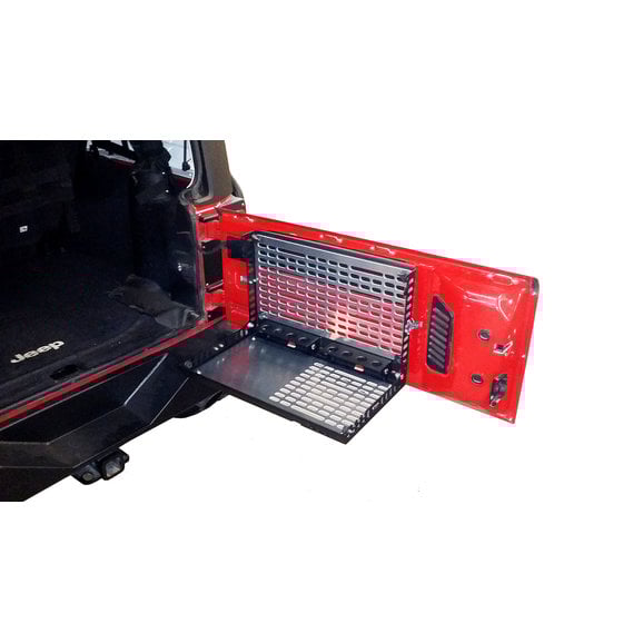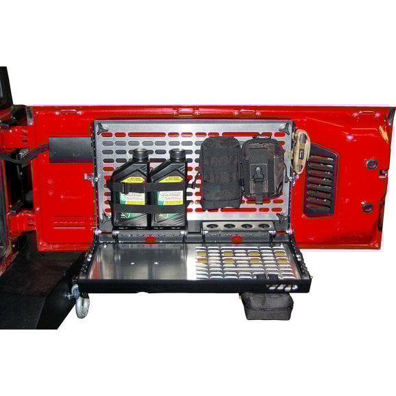 Introducing the new Warrior Products Tailgate Table Storage System! This fully lockable, theft-proof storage solution features interchangeable and fully customizable panels. The panels are completely removable, making transporting your gear as easy as unscrewing four wing knobs. Stationary, load-bearing hinges provide Warrior's Tailgate Table Storage System with a shelf to keep gear in place when opening and closing the table, as well as eliminating the need for support cables/bars which may interfere with work space on the table. Also, due to the addition of rubber snubbers and riveted latches, this table will not rattle or vibrate when off-road. A complete P.A.L.S. system for MOLLE / Tactical Bags and accessories maximizes the Wrangler's available cargo space. With interior and exterior storage functionality, in addition to integrated hangers on each side, the Warrior Tailgate Table Storage System provides unparalleled organization for your vehicle's cargo area. Constructed using rust-free Aluminum panels with a heavy-duty, powder-coated, steel frame. This product includes all necessary installation hardware.