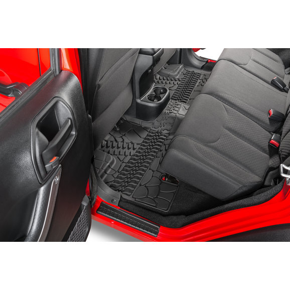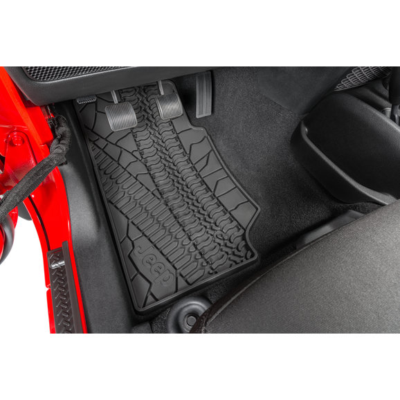 How cool are these new slush mats? Available for both the 2 and 4 door JK Wranglers, these heavy duty rubber slush mats get the job done! The rock pattern design and tire print, along with the Jeep® logo, adds a certain attitude to your Wrangler. Available in Slate Grey only.