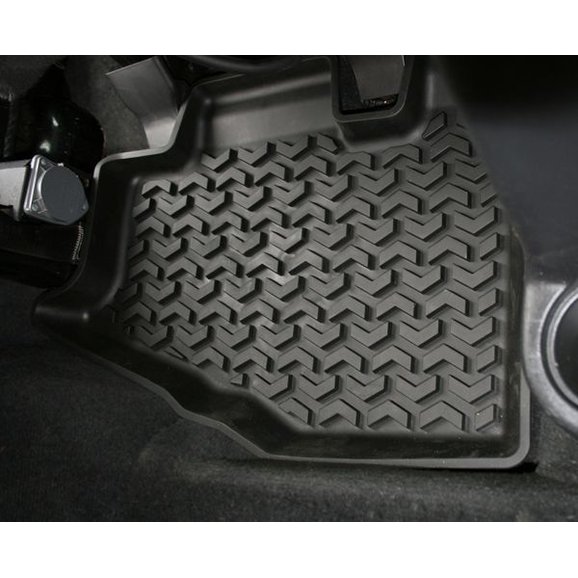 Rugged floor liners from Rugged Ridge. Precision engineering using state of the art technology ensures an exact fit to the shape and contour of your vehicle's floor. The deeply molded Chevron-shape tread pattern channels dirt, mud and snow away from the driver to keep shoes and pant legs clean. It also contains the movement and sloshing around of any trapped water. The high perimeter wall offers a large footprint and maximum interior protection and containment.