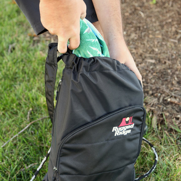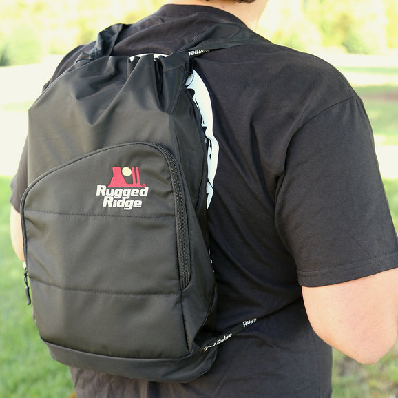 A great light weight backpack perfect for grabbing and going, this knapsack is a must have for any day hike, camping trip, or outdoor adventure. Featuring a large 10 x 11 inch front pocket with two interior compartments for added storage and organization, this new black backpack is made of a weather resistant nylon material and has the Rugged Ridge logo embroidered across the front.