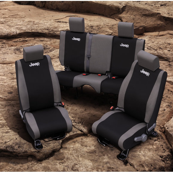 Front, Black Wet Suit-like material, with Jeep Logo. DO NOT INSTALL ON VEHICLES EQUIPPED WITH SEAT AIRBAGS.