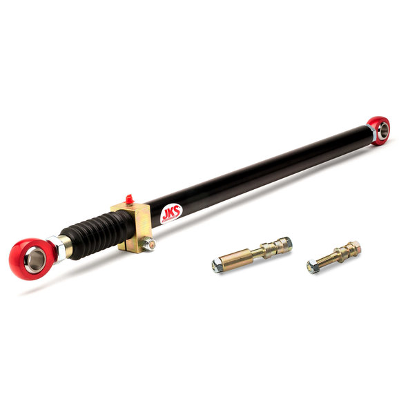 The JKS Telescoping Trackbar is a direct replacement for the original and features a locking, slip-shaft mechanism that is greasable for smooth, silent operation. When unlocked, the trackbar becomes transparent to the vehicle, allowing unrestricted suspension travel and maximum off-road performance. To prevent binding, high quality, Teflon-lined heim joints attach the trackbar to the axle and chassis.
