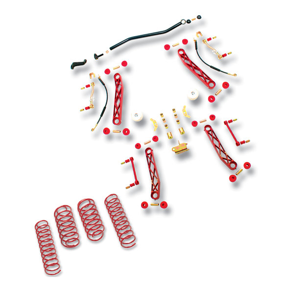 This is Rancho's most aggressive 2.5" lift TJ suspension system that allows the use of 32"x12.5" wide tires to tackle the toughest terrain. This ultra high suspension articulation with RTI scores exceeding 1100 includes 4 high- articulation lift springs. Included are both front and rear lower suspension arms which feature grease fittings, double cushion bushing and barrel design, which allows for unprecedented suspension articulation while preserving the factory ride quality.